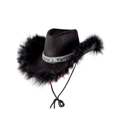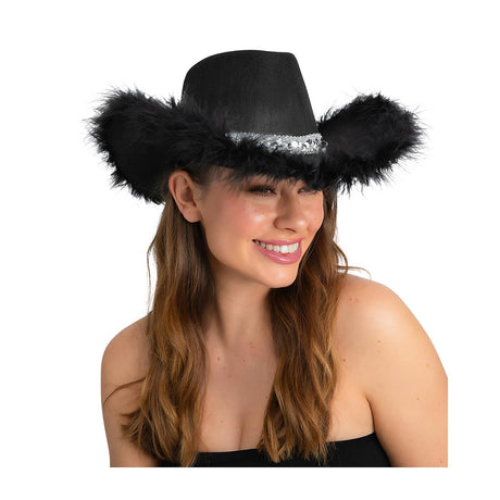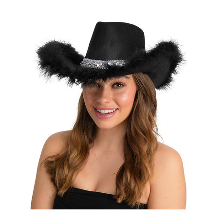 Sequins & Marabou Feather Texan Cowboy Hat (Black) - Adult