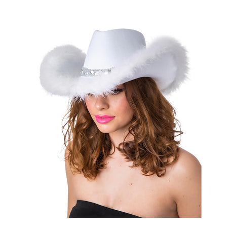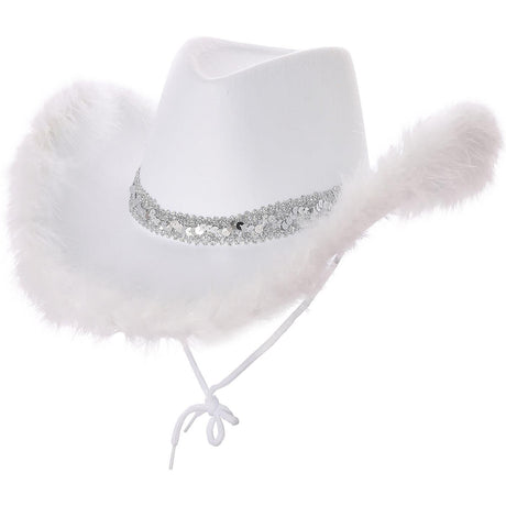 Sequins & Marabou Feather Texan Cowboy Hat (White) - Adult