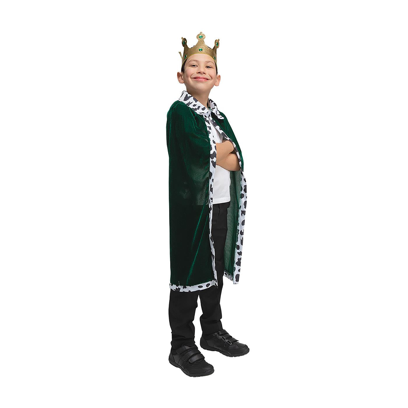 Let your child step into the role of a wise king with this green velvet robe and crown set. Finished with a cow print trim, this regal costume is ideal for nativity plays, school shows, historical themes, or imaginative play. A simple yet striking outfit for any budding royal!