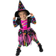 The costume includes a bright witch dress with matching hat and colourful striped tights to complete the magical look. A cheerful twist on a classic Halloween witch, this outfit is ideal for children who love fun, quirky costumes.