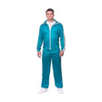 Survive the fancy dress party in style with this teal-coloured tracksuit inspired by your favourite South Korean game drama show. This 2-piece jogging suit features a teal blue colour with a white stripe running down the sleeves and trouser legs. The tracksuit top is equipped with a full-length white zip for easy wearing and removal. Complete the look with a pair of white trainers, and you're ready to play!
