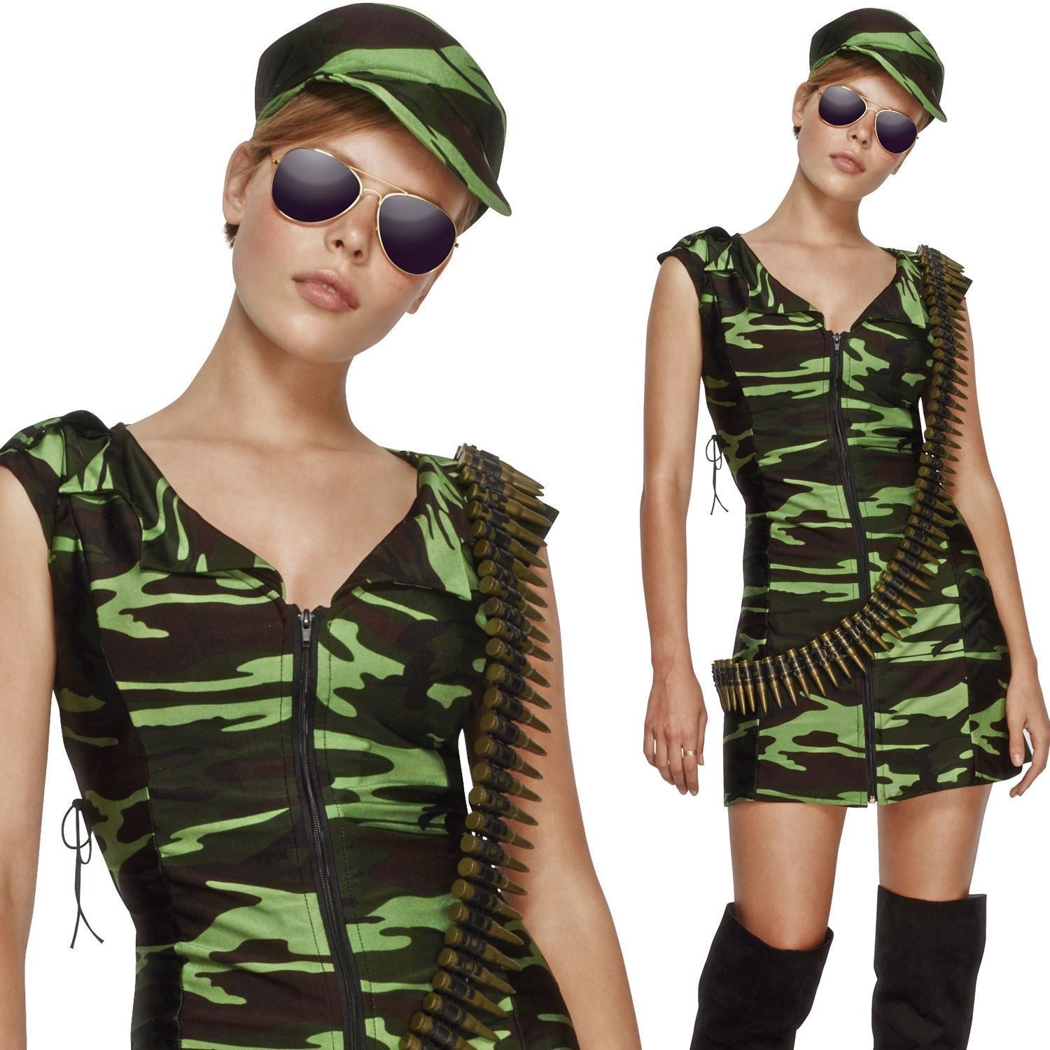 Atteeeention! March into the party in style with this striking women’s army camouflage costume. Featuring a classic camo green dress and matching cap, this outfit is perfect for military themed fancy dress parties, Halloween, or hen nights. Pair it with aviator specs, fishnet stockings, or a bullet belt (sold separately) to complete the look and stand out from the crowd.